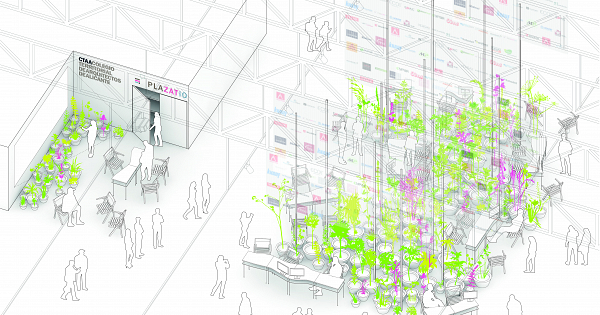 El impacto de la recesión económica en la profesión y la aceleración de los efectos cambio climático en los ecosistemas ha empujado a los arquitectos y arquitectas a desarrollar estrategias que planteen una alternativa a los modelos clásicos de producción arquitectónica. La arquitectura se ha convertido en un laboratorio de experimentación que permite testear nuevas estrategias de sostenibilidad medioambiental y económica: sistemas constructivos más rápidos de montar, materiales con menor impacto ambiental, instalaciones más eficientes, etc. El stand propuesto busca ser una celebración de esta redefinición de los ciclos metabólicos de la obra arquitectónica, reforzando el compromiso de la institución del CTAA con las economías colaborativas y su impacto en el medio ambiente. El proyecto se puede resumir en 5 estrategias: 1. STAND ‘CIRCULAR’ Se plantea el stand como un espacio sujeto a dinámicas de economía circular en el que todos los materiales y elementos constructivos no se consiguen por una adquisición convencional, sino que siguen un proceso alternativo, bien de alquiler o bien compra y posterior donación. De esta manera, se consigue recircular los materiales constructivos del stand una vez terminado el evento, devolviendo parte de la inversión a las organizaciones participantes. 2. PONER EN VALOR LO VIVO Y LO NATURAL El proyecto busca situar a lo natural como protagonista del espacio. Se propone la creación de un ambiente poblado por vegetación exuberante, huyendo de los convencionales planteamientos materiales inertes. El stand constituye, así, un ejemplo de arquitectura con huella ecológica negativa, que fomenta el uso de materiales naturales en la arquitectura a la vez que contribuye a la reducción del CO2 de la atmósfera. 3. UN PUNTO DE ENCUENTRO DENTRO DE FIRAMACO La propuesta evita acotar el stand ajustándolo a la cuadrícula del recinto ferial. Se pretende que el espacio que rodea el stand fluya alrededor de este, desdibujando sus límites y convirtiendo un punto de paso en un punto de encuentro: una plaza donde conversar, descansar, observar, etc. Se extiende el mismo planteamiento al stand del CTAA, de manera que se acentúa aún más la idea de espacio fluido sin límite definido y se establece una clara correspondencia formal y material entre ambos espacios expositivos. 4. INTERVENCIÓN BLANDA Se plantea un stand “blando”, que simplifique al máximo los sistemas constructivos y que no requiera de un montaje especializado ni del transporte de elementos voluminosos, reduciendo así los costes de fabricación. Casi la totalidad de los elementos del stand se pueden cambiar de sitio: mesas, sillas, plantas y proyectores. Se pretende que el stand sea capaz de absorber cambios en la disposición de sus elementos durante los 3 días de uso de la feria. 5. MÁS ALLÁ DE LA FERIA El diseño del stand sigue una política de cero excedentes, buscando reubicar los materiales y los elementos constructivos que lo componen. Los materiales alquilados volverán a su empresa de origen, mientras que los elementos diseñados como mobiliario o telas/nubes serán cedidos o reconvertidos y regalados. Se busca que el stand no sea un proyecto temporalmente finito, sino que tenga la capacidad de transformarse y seguir teniendo utilidad pasados los tres días de la feria. 1000 JARDINES Estos esquemas muestran las posibles configuraciones espaciales del jardín con las que sea ha especulado. El emplear vegetación plantada en maceta permite dar forma a la masa verde con total libertad. Tras varias iteraciones en el diseño del jardín, se ha optado por configurar una forma orgánica que rompa la rígida retícula del espacio ferial, creando un espacio de paso fluido que refuerza el carácter natural de la propuesta. A su vez, se consigue dilatar el perímetro de la masa verde de manera que se puedan ubicar hasta los 16 mostradores que requieren las bases. Esta disposición geométrica permite, además, crear entrantes y salientes en el jardín, creando ambientes recogidos y haciéndolo más atractivo de recorrer. MESAS FLEXIBLES Se propone la creación de un set de 18 mesas/mostrador que produzcan un 0% de desperdicio de material en su fabricación. Están formadas por 2 tableros (2 cm sup. y 1 cm inf.) y 4 patas de varilla roscada, que permiten aumentar o disminuir la capacidad del estante destinado a la colocación de catálogos. Un patrón de corte permite la combinación de las mesas en distintas configuraciones. Esta cualidad hace que el set de mesas resulte útil para el montaje de exposiciones, motivo por el cual planteamos la donación de estas piezas de mobiliario al CTAA tras la clausura de la feria. SILLAS PLEGABLES A modo de homenaje a las emblemáticas sillas de la Explanada, se propone adquirir alrededor de 40 unidades de ese modelo y disponerlas por todo el jardín, pudiendo ser cambiadas de lugar con facilidad. Esta cifra es, aproximadamente, la que necesita reponer el Ayto. de Alicante mensualmente en el paseo de la Explanada, por lo que se propone su donación a esta institución una vez concluida la feria. TELAS CONVERTIBLES Se propone colgar unas telas de tul blanco desde las cerchas de la nave a modo de “nubes sobre el jardín”, e imprimir sobre ellas los logotipos de las empresas con Convenio Plazatio. Como estrategia para dotar a estos elementos de una segunda vida, se plantea colocar los logos a modo de retícula, sobre la que se dispone un patrón de corte que permita convertir las telas en retales rectangulares. Estos retales se convierten en bolsas con el logo de cada empresa, según el proceso descrito en el diagrama superior. De este modo, tras la feria las telas serán desmontadas, recortadas y convertidas en bolsas promocionales, que se entregarán a las empresas con convenio a modo de obsequio. PRESUPUESTO CERO Dado el carácter de economía circular del proyecto, se sugiere un presupuesto que considere la recirculación del 
