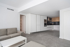 Con el objetivo de llevar la luz a todos los espacios se crea un espacio diáfano en el que se distribuye la zona pública. Se opta por la sencillez de los materiales; el suelo y la encimera se resuelven con microcemento y la armariada con madera lacada. Un retrato del artista local Paco Besó sobre uno de los paramentos contrasta con los tonos neutros del resto de materiales.