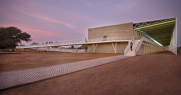 En Senegal la sombra y el agua lo son todo. Este proyecto de Centro de Formación e Investigación en deporte de alto nivel, es primo-hermano de un aulario en Bambey que desarrollamos también por encargo del Ministerio de Educación y el Banco Mundial, y que pretende responder a este contexto como la máquina perfecta, bella en su eficiencia. El conjunto se articula en tres volúmenes: aulario, polideportivo y piscina olímpica de 50x25 m. Al igual que en el edificio de Bambey planteamos el diseño desde la sección, dotando al edificio de una gran cubierta doble y una gran celosía hacia el sur, un escudo en forma de “L” tumbada, que evita la radiación solar directa, pero es permeable al aire. Este escudo crea un efecto Venturi generando un flujo de aire constante entre envolvente y aulas reduciendo la temperatura interior en 10-15ºC frente a los habituales 40-45ºC en el exterior. Los edificios son constructivamente sencillos, adecuados a las posibilidades del lugar, siendo el material por excelencia bloques de hormigón construidos a pie de obra revestidos con mortero. La celosía de la fachada del zócalo de la piscina es de bloques perforados fabricados artesanalmente in situ favoreciendo el empleo de mano de obra local; y la de la fachada de protección al Sur es de acero perforado, pintado como las redes de los barcos del puerto de San Luis, con los colores de sus piraguas, y con un suave movimiento, como cuando atracan tras la dura jornada de pesca.