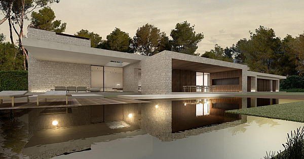 “La casa se confina dentro de unos muros de piedra a modo de recinto, donde se genera un espacio íntimo en el que se construye un universo propio”, Ramón Esteve. HORIZONTALIDAD El origen del proyecto se desarrolla a partir de una serie de cajas contenedores de programa y patios de luz, cosidos entre dos plataformas horizontales que delimitan el espacio. Con el fin de potenciar estos dos elementos, el pavimento se eleva a 30cm del suelo. La sensación de horizontalidad se mantiene a través de ese pavimento y la cubierta de hormigón blanco visto, piezas que albergan las cajas donde se sitúan diferentes estancias. JUEGO DE CAJAS La distribución de las cajas entre los planos de hormigón genera espacios intermedios que cosen los diferentes volúmenes y albergan los usos compartidos de la vivienda. Espacios interiores con continuidad exterior, que presentan visuales enmarcadas del jardín que rodea la vivienda y permiten el cruce de perspectivas entre diferentes puntos. Los volúmenes que se introducen bajo la losa se muestran como contenedores de las estancias más privadas, haciéndose perceptibles a través del cambio de las alturas. El retranqueo de los volúmenes se replica en el diseño de la piscina, a través de un rectángulo quebrado que recuerda el conjunto horizontal y la introducción de estos elementos. MATERIALIDAD Los materiales se muestran en su estado natural mediante el uso de madera, piedra natural y hormigón. Las cajas que contienen las diferentes estancias son de piedra de mampostería, diferenciándose del resto de elementos de la vivienda por su materialidad. A través de la presencia de las contras de madera, se matiza la entrada de luz natural a la vivienda. La losa horizontal que se apoya sobre los volúmenes, muestra el estado natural del hormigón blanco. LUCES Y SOMBRAS Se juega con la luz natural, controlando su entrada indirecta en cada una de las estancias. Los espacios generados entre los volúmenes y los huecos en la losa crean un contraste de luces y sombras a lo largo de la vivienda.