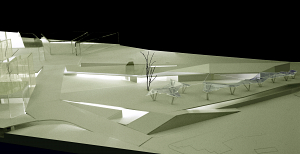 Este proyecto se propone como un lugar intermedio entre la arquitectura y la infraestructura, de modo que lo edificado se trasforma en topografía y la adecuación de los espacios urbanos encuentra en sus movimientos, grietas y fisuras donde se implantan diversos espacios y usos. El lugar está fuertemente ligado a la historia de la Ciudad por haber constituido desde siempre un punto de unión con el territorio, el Clot, el lugar donde antaño los paisanos acudían a por el agua. Si bien el proyecto suponía una intervención muy intensa debido a la necesidad de ubicar un programa extenso, que incluye dos plantas de aparcamiento bajo rasante, se intentó mantener esta vocación de punto de articulación entre el pueblo y la ciudad nueva, entre la ciudad y el campo, la montaña y la vista al mar. Por ello se propone una implantación de estructuras que se doblan, y se pliegan, o entrecruzan, forzando el reconocimiento de la topografía y el movimiento, la relación entre distintos puntos periféricos, la insistencia en el carácter público, accesible y abierto. Sólo después de hallar una solución compatible con la condición de borde del lugar, se implanta el programa específico de usos, que halla su espacio entre los pliegues y grietas que surgen.